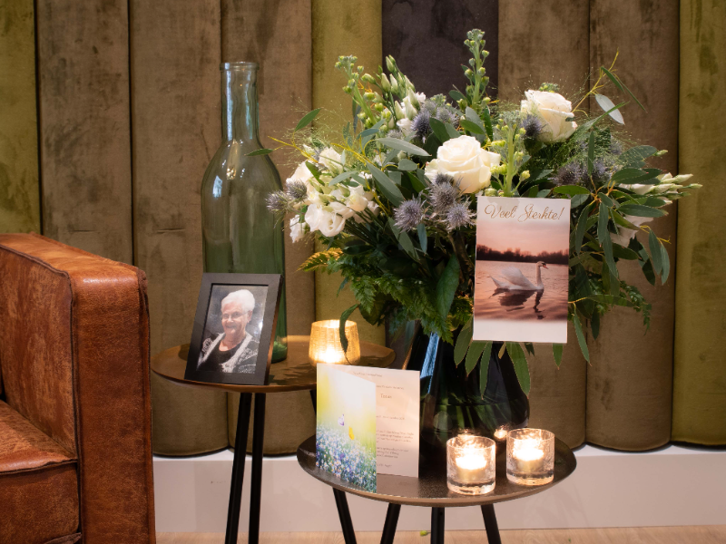 Dit boeket is bedoeld om de nabestaande te condoleren en veel sterkte te wensen en is niet bedoeld om bij een overledene te laten bezorgen, maar uitsluitend bij nabestaanden thuis. Getoonde formaat is middel.